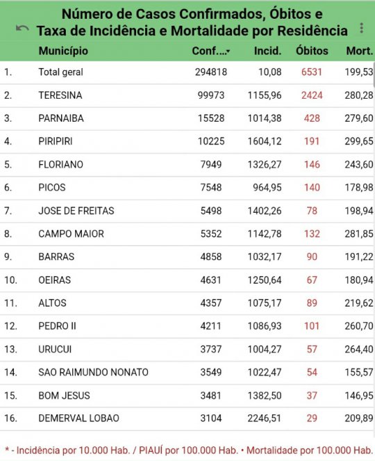Campo Maior chegou agora a 133 mortes provocadas pela covid. De acordo com o último boletim epidemiológico da Secretaria de Estado da Saúde (SESAPI), o município tem atualmente 5352 casos confirmados da doença.
