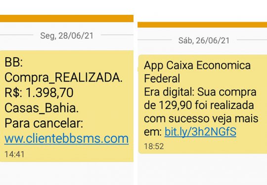 "Acordei com uma mensagem de texto dizendo que fiz uma compra de R$ 1.398 na Casas Bahia. De ínicio, o susto foi grande porque mandaram a mensagem como se fosse o Banco do Brasil, que é uma agência que tenho cartão. Mas não cliquei. Entrei no aplicativo do meu banco e vi que não tinha nada. Então, tive a certeza que era um golpe. No dia seguinte, chegou outra mensagem de texto da Caixa informando de uma compra de R$ 129. Só que nem conta nesse banco eu tenho", disse uma internauta.