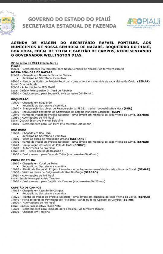 O secretário da Fazenda visita também o município de Capitão de Campos. Lá, às 17h30, o gestor planta árvores do Projeto Recordar. Em seguida, visita as obras de pavimentação poliédrica executadas pela Secretaria de Estado do Turismo (Setur).