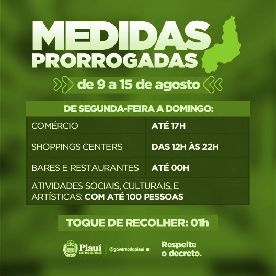 O novo decreto assinado pelo governador também mantém o toque de recolher em todo o estado do Piauí. No período abrangido pelo decreto, ficará proibida a circulação de pessoas em espaços e vias públicas, ou em espaços e vias privadas equiparadas a vias públicas, no horário compreendido entre 1h e 5h, ressalvados os deslocamentos de extrema necessidade.