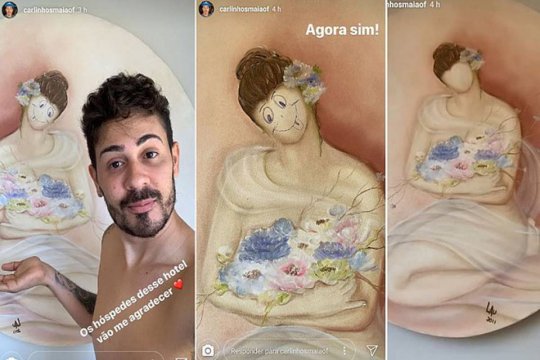 O quadro original mostrava uma mulher sem rosto segurando um buquê de flores. E Carlinhos decidiu usar uma caneta para desenhar olhos e boca na personagem enquanto era filmado por seu marido, Lucas Guimarães. “Os hóspedes desse hotel vão me agradecer“, declarou o humorista na ocasião.