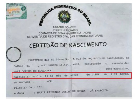 O Instituto Nacional do Seguro Social (INSS) no Acre divulgou esta semana a história do ex-seringueiro João Coelho de Souza, de 131 anos. Segundo a certidão de nascimento, ele nasceu em 10 de março de 1884, na cidade de Meruoca (CE).
