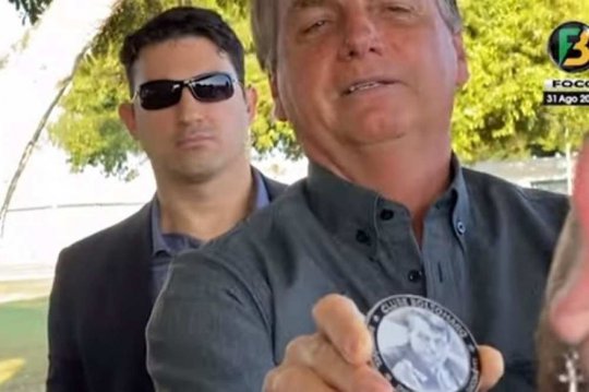 O presidente Jair Bolsonaro exibiu, nesta terça-feira (31/8) a apoiadores, uma medalha com uma expressão que costuma utilizar e chamar de "3 Is". O objeto possui uma foto do mandatário com os dizeres: "Clube Bolsonaro - Imorrível, imbrochável e incomível". Na saída do Palácio da Alvorada, o mandatário mostrou a medalha aos bolsonaristas e pediu que a lessem. "Minha mulher não pode ver isso não. Essa medalha não é qualquer um que tem não, pô", emendou rindo.