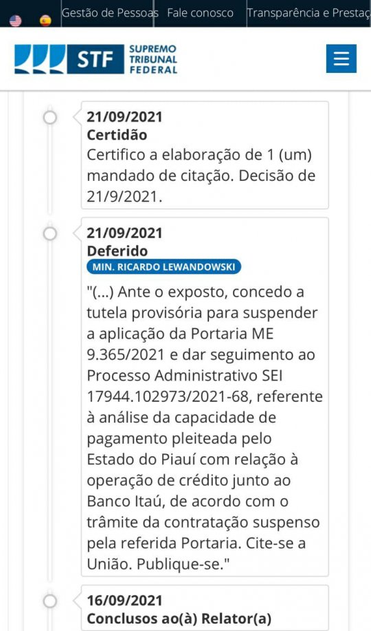 “Concedo a tutela provisória para suspender a aplicação da Portaria ME 9.365/2021 e dar seguimento ao Processo Administrativo [...] referente à análise da capacidade de pagamento pleiteada pelo Estado do Piauí com relação à operação de crédito junto ao banco Itaú, de acordo com o trâmite da contratação suspenso pela referida Portaria”, diz trecho da decisão do ministro do STF.