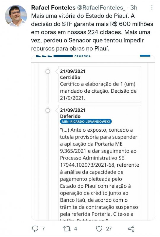 O coordenador do Pró-Piauí, comemorou a decisão através de suas redes sociais e ainda mandou um recado ao Senador Ciro Nogueira, sem citar nomes. “Mais uma vitória do Estado do Piauí. A decisão do STF garante mais R$ 600 milhões em obras em nossas 224 cidades. Mais uma vez, perdeu o Senador que tentou impedir recursos para obras no Piauí”.