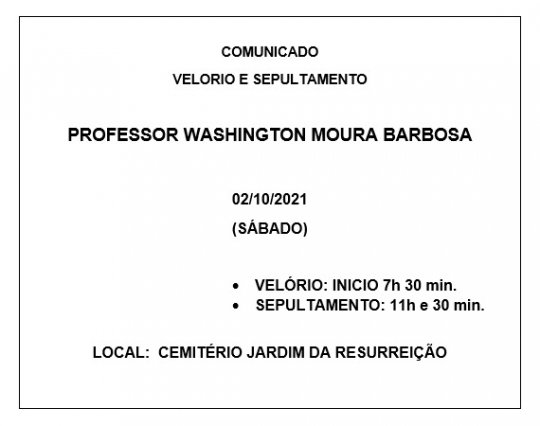 O Instituto Federal do Piauí (IFPI) Campus Campo Maior declara luto oficial em virtude do falecimento, na sexta-feira, 01/10/2021, de Washington Moura Barbosa, professor aposentado do Instituto Federal do Piauí e ex-Diretor do Campus Campo Maior. Assim, as atividades no campus estarão suspensas na segunda-feira (04), e o retorno das atividades acontecerá, na terça-feira, 5 de outubro.