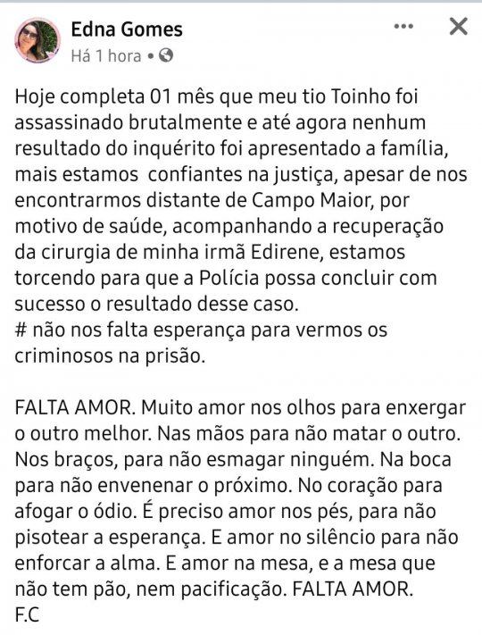 Agora a família, através da sobrinha da vítima, Edna Gomes, fez um apelo em suas redes sociais, para que a justiça apresente um inquérito de conclusão do caso e o acusado preso pelo crime.