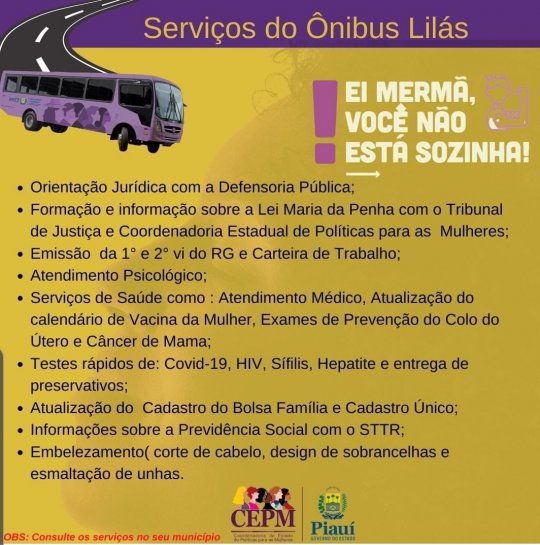 A Comunidade Água Fria na zona rural de Campo Maior (PI), receberá nesta terça-feira (26), a partir das 08hrs, o Ônibus Lilás, projeto do Governo do Piauí, através da Coordenadoria de Estado e Políticas para as Mulheres.