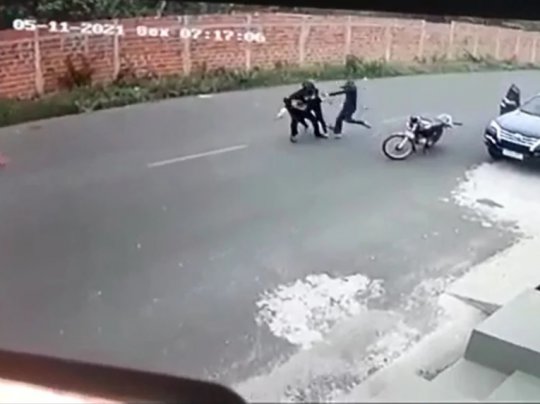 Nas imagens, é possível perceber que o policial estava na porta da residência limpando um veículo, quando os criminosos chegam. A primeira dupla aborda o agente, que reage na sequência e é agredido. Um terceiro ajuda os comparsas, enquanto o quarto espera em uma das motos. Eles conseguem pegar a arma do policial, realizam um disparo contra ele e fogem em destino ignorado.