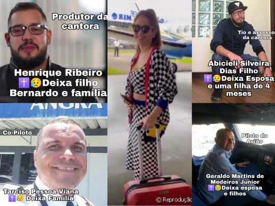 Além da cantora Marília Mendonça, de 26 anos, outras quatro pessoas morreram nesta sexta-feira (5) após a queda de um avião próximo a uma cachoeira de pequeno porte em Caratinga, interior de Minas Gerais. Veja que já se sabe sobre a queda do avião. A aeronave levava o produtor e o tio de Marília, além do piloto e copiloto. Veja quem são as vítimas do acidente: