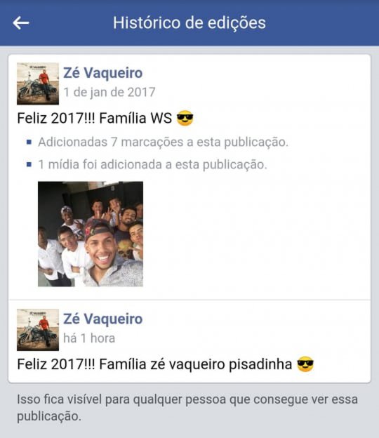 Um post original de 2017 dizia "família WS", (de Wesley Santos). Ele editou em 2020 o texto para "família zé piseiro" antes de mandar os links para o site g1.