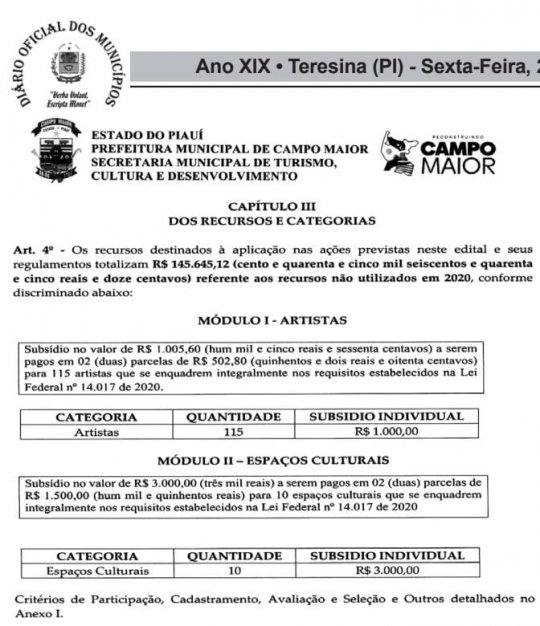 Alguns artistas Campomaiorenses estão revoltados com o resultado do edital da lei Audir Blanc disposto pela Prefeitura de Campo Maior (PI), para auxiliar os custeios dos profissionais da cultura durante a pandemia.