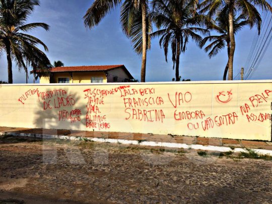 Na terceira pichação, além das ameaças, há também xingamentos às vítimas. "Pilantras, marmita de ladrão, vão morrer tudo. Juscyane Dourado, Jayne, Yarla, Alinne, Dane Veras, Lala Béki, Francisca, Sabrina, vão embora ou vão entrar na bala. Assinado: Crime", diz uma das pichações que tomam boa parte de um muro.