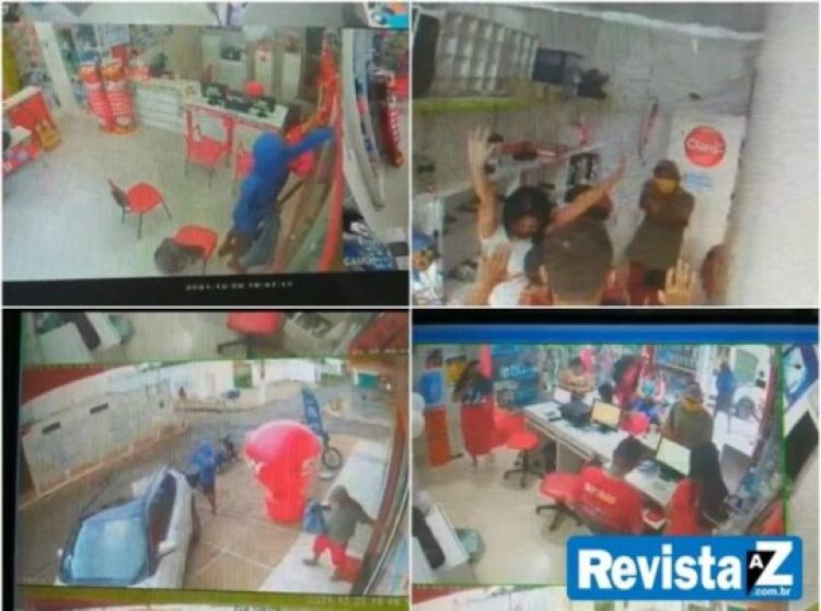 A ação, que ocorreu por volta das 16h45, foi filmada pelo sistema de câmeras de segurança do estabelecimento e mostra os criminosos chegando em uma motocicleta e segundos depois anunciam o assalto.