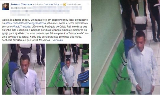 A servidora Sokorro Trindade escreveu a forma como foi abordada: ?Gente, hoje a tarde chegou um rapaz no meu local de trabalho na Maternidade Dona Evangelina Rosa. Sabia meu nome e setor. Identificou-se como Paulo Trindade, di?cono da Par?quia do Cristo Rei. Me disse que eu tinha sido escolhida e indicada por duas vizinhas minhas e membros da igreja para ajud?-lo com uma quantia que faltava para ir ? Trindade ?GO?, disse a v?tima.?