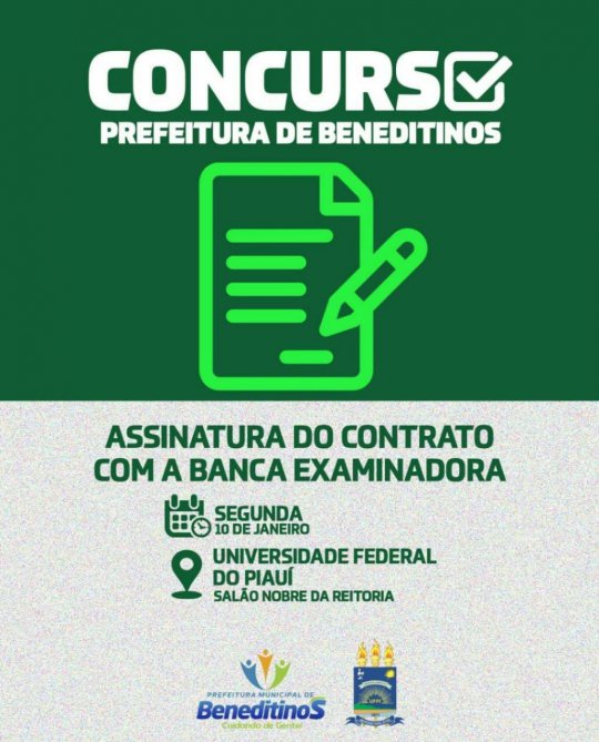 A prefeitura de Beneditinos (PI) informou nesta sexta-feira (07) que assinará na próxima segunda-feira (10) com a Universidade Federal do Piauí - UFPI, para ser a banca examinadora do concurso púbico municipal. O certame abrirá 60 vagas em várias áreas e níveis para a administração pública do município.