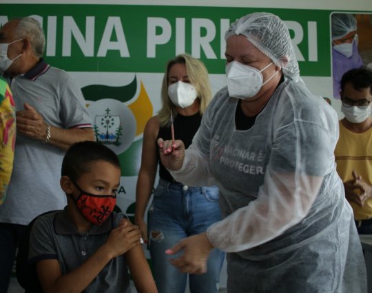 Marcos Vinícius da Silva Santos, de 7 anos, uma criança indígena da tribo Tabajara, foi a primeira criança a ser vacinada contra a Covid no Piauí, neste sábado (15). Ele e mais nove crianças foram vacinadas na cidade de Piripiri, Norte do Piauí. A vacinação segue ordem de prioridade determinada pelo Ministério da Saúde.