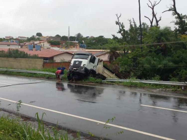 Um caminhão ficou pendurado na lateral da BR-343, na saída de Teresina com destino ao Norte do estado, por volta das 5h deste sábado (15). O condutor, que não quis se identificar, contou que perdeu o controle na pista molhada ao tentar frear no local.