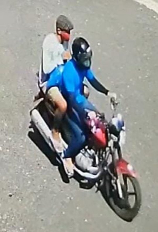 Imagens correram as redes sociais em que aparecem dois homens jovens, em uma moto vermelha. O piloto vestindo calça jeans, camisa azul e capacete preto, enquanto o carona trajava bermuda, chinelos e uma camisa cinza manga longa e um volume parecido com um malote de dinheiro aparece entre os dois.