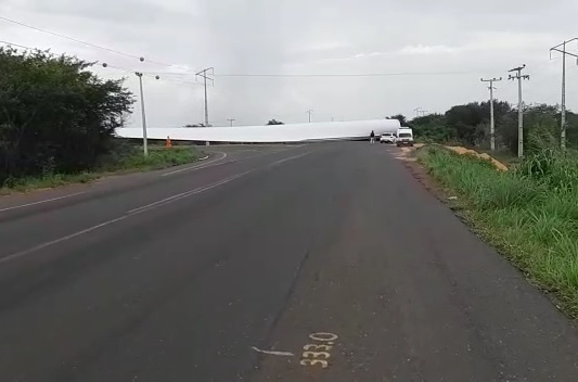 Policiais Rodoviários Federais estão no local sinalizando a via e a empresa responsável pelo transporte da carga já foi acionada. O veículo, que transportava uma pá eólica, tombou ao tentar realizar uma manobra de conversão na BR 020. O evento interditou totalmente a rodovia e não há previsão de liberação.