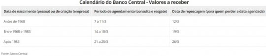 Ao fazer esta primeira consulta, o cliente do banco recebe uma data e período para consultar e solicitar o resgate do saldo existente. As datas são agendadas de acordo com o ano de nascimento da pessoa ou da criação da empresa, conforme calendário abaixo.