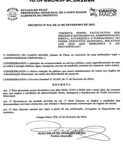 A Prefeitura Municipal de Campo Maior (PI) publicou no dia 22 de fevereiro um documento no Diário Oficial dos Municípios um documento decretando que nos dias 28/02, 01/03 e 02/03 (até o meio dia) será ponto facultativo nos órgãos e entidades da administração pública direta, autárquica e funcional do município.