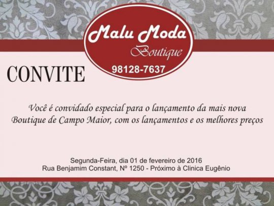 Os melhores lançamentos e tendências em moda masculina e feminina e as coleções que vão ser moda em 2016. Malu Moda Boutique, a nova loja de Campo Maior, com roupas para ele e ela arrasar neste carnaval. Para mais informações ligue: 98128-7637.