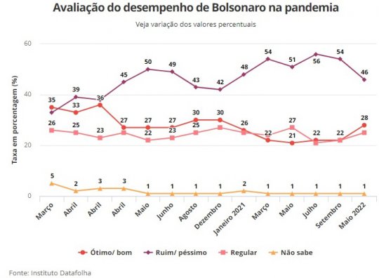 Com o Brasil chegando à marca de 660 mil mortes por Covid-19, a avaliação do desempenho do presidente Jair Bolsonaro (PL) em relação ao enfentamento da pandemia melhora, segundo pesquisa Datafolha.