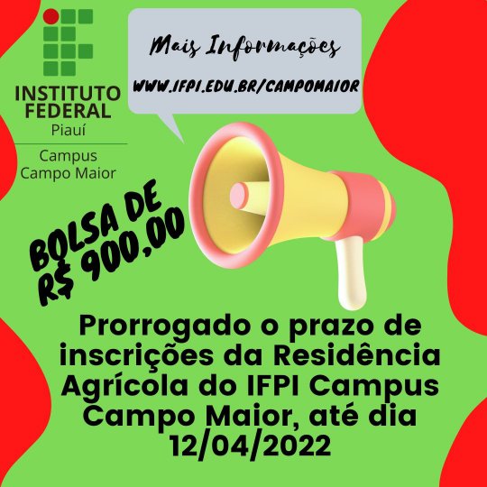 O Campus Campo Maior do IFPI ampliou, até 12 de abril, o prazo de inscrição para seleção de residentes bolsistas do Programa Residência Profissional Agrícola. A informação está na errata publicada hoje, 6, pelo campus.