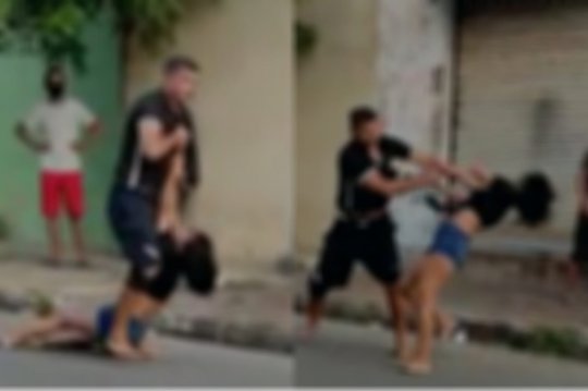 Depois de inúmeras tentativas de separar os dois, o homem tenta sair, mas a mulher pula no pescoço e ele a atira no chão com extrema violência, que por muito pouco, ela batia a cabeça no meio fio do calçamento.