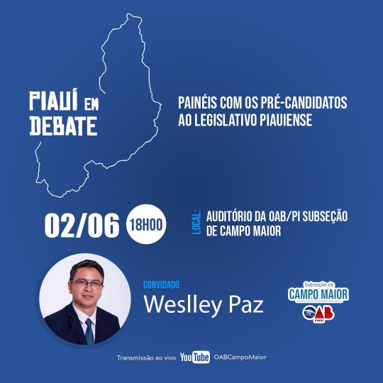 O pré-candidato a Deputado Federal, Weslley Paz (Solidariedade) será sabatinado nesta quinta-feira (02) no Painel Piauí Debate da OAB de Campo Maior (PI).