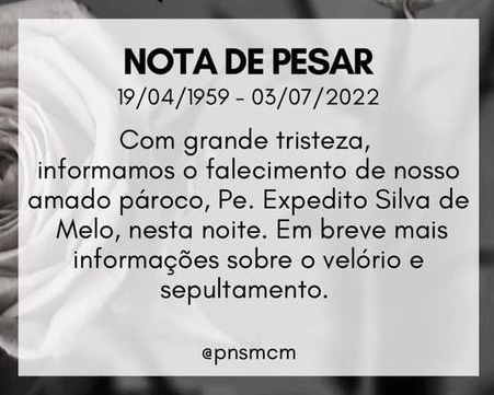 "Com grande tristeza que comunicamos o falecimento de nosso pároco Padre Expedito Silva de Melo, onde cumpriu sua linda missão aqui na terra. Em breve divulgaremos informações sobre o velório e sepultamento."
