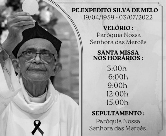 O velório e o sepultamento será na paróquia de Nossa Senhora das Mercês com a solenidade da santa missa nos seguintes horários: