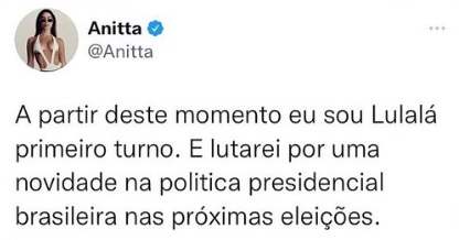 A cantora Anitta usou as redes sociais, nesta segunda-feira (11) para declarar apoio ao pré-candidato à presidência Lula logo no primeiro turno das eleições deste ano.