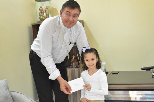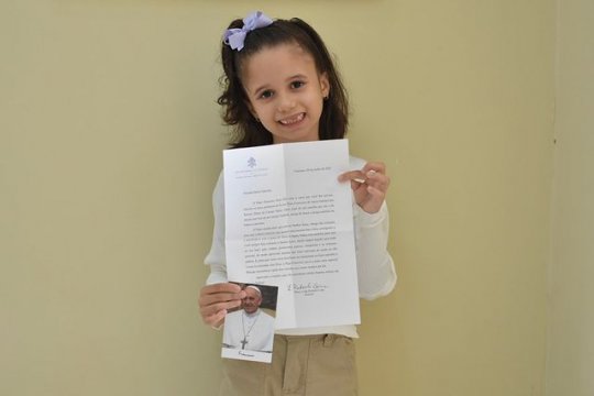 Segundo a comunicação da Diocese, Maria Gabriela tem 7 anos e participa da santa missa todos os domingos. Tão logo ouviu que Dom Francisco visitaria o papa, e que levaria cartas para ele, a menina teve a iniciativa de escrever ao pontífice pedindo que ele abençoasse todas as crianças. Maria Gabriela recebeu na manhã desta sexta-feira(15) a carta resposta das mãos de Dom Francisco.