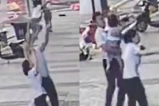 Imagens de câmeras de segurança mostram a criança o momento em que o homem pega a menina no colo, evitando que ela caia no chão.