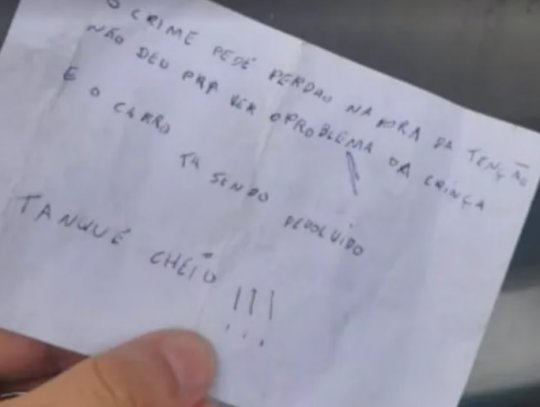 Dentro do carro, os criminosos deixaram um bilhete, com pedido de perdão: