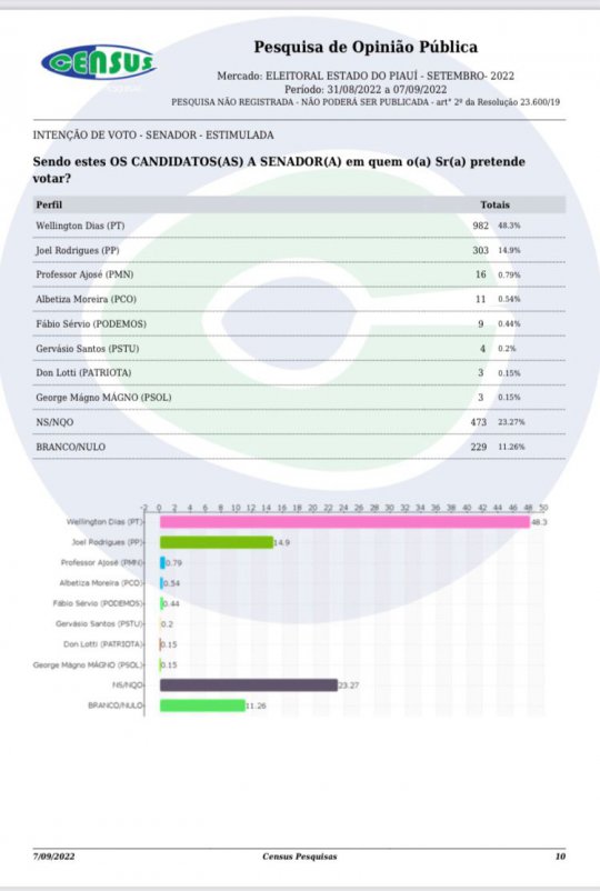 O ex-governador Wellington Dias (PT) vence a disputa para senador com 48,3% na estimulada, segundo a Pesquisa Census. Joel Rodrigues (Progressistas) aparece com 14,9%. Os outros candidatos aparecem com menos de 0,79%. Não sabem ou não opinaram somam 23,27% e branco ou nulo 11,26%.