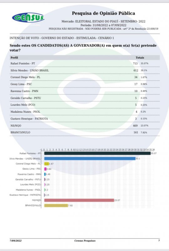 FICHA TÉCNICA - A pesquisa do Instituto Census foi contratada pelo Partido Social Democrático (PSD) e realizada entre 31 de agosto e 07 de setembro. Foram entrevistados 2.033 eleitores em 88 municípios do Piauí, distribuídos por cotas de sexo, idade, grau de instrução e renda em relação ao eleitorado total desses municípios.