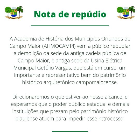 A Academia de História dos Municípios Oriundos de Campo Maior (AHMOCAMPI) emitiu uma nota de repúdio na tarde desta quinta-feira (15) contra a demolição da antiga Cadeia Pública da cidade, situada no cruzamento das ruas Capitão Manoel Oliveira e Cel. Eulálio Filho.
