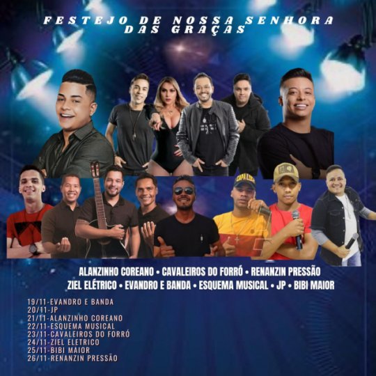 A Prefeitura Municipal divulgou as datas de cada atração. Neste ano serão atrações principais a banda Cavaleiros do Forró, Renanzin Pressão, e o dono do HIT do momento, "Pega a Guanabara e vem", Alanzinho Coreano. Confira: