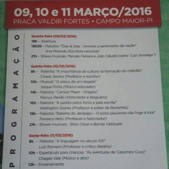 O Sal?o do Livro de Campo Maior acontece nos dias 09, 10 e 11 de mar?o, atrav?s da Secretaria Municipal de Educa??o, gerenciada pelo Professor Ribinha e com emenda do Deputado Estadual Alu?sio Martins que custear? as atra??es liter?rias de n?vel nacional que estar?o no evento e fazem parte da programa??o das comemora??es dos 193 anos da Batalha do Jenipapo. A festa liter?ria ser? realizada no Espa?o Cultural Valdir Fortes.