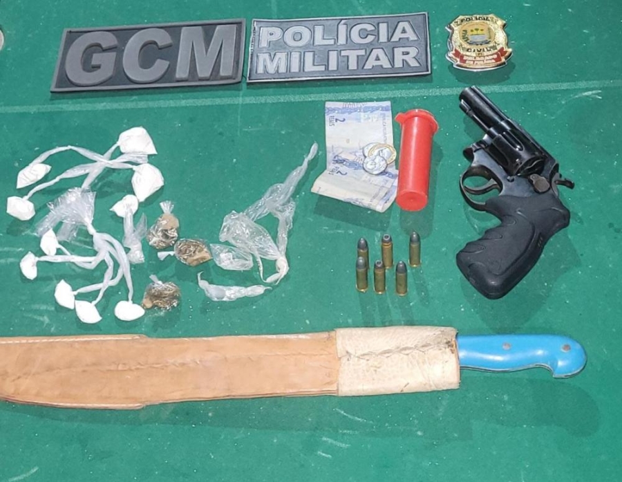 Com o suspeito foram apreendidas uma motocicleta, grande quantidade de substâncias análogas à cocaína, um revólver calibre .38 e um facão.