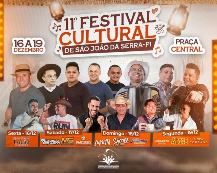 A Prefeitura Municipal de São João da Serra (PI) divulgou nesta sexta-feira (16) a programação do 11° Festival Cultural que iniciará nesta sexta-feira (16) e vai até o dia 19 de desembro com diversas atrações e atividades para todos os moradores e visitantes.