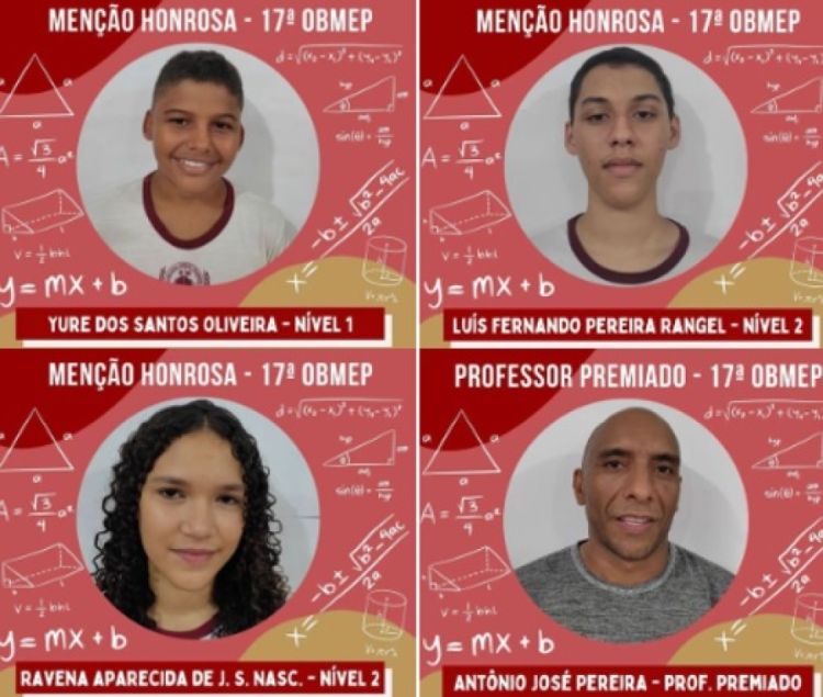 Parabéns aos estudantes Yure dos Santos Oliveira (Menção Honrosa – Nível 1); Luís Fernando Pereira Rangel (Menção Honrosa – Nível 2); Ravena Aparecida de Jesus da Silva Nascimento (Menção Honrosa – Nível 2) e ao Prof. Antônio José Pereira (Lelé – Professor Premiado) por todo o empenho e esforço.