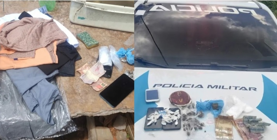 Diante da situação a polícia acompanhou o suspeito até o local onde foram apreendidas 35 pinos de cocaína, 25 papelotes pequenos de maconha, 02 frações maiores de suposta maconha, além de dinheiro, roupas e celulares.