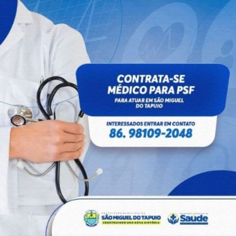 A Prefeitura de São Miguel do Tapuio (PI) torna público a chamada para a contratação de médico para atuar no PSF do município. O anúncio foi feito pelo prefeito Pompílio Evaristo em seu perfil do instagram. Ainda conforme o anúncio, os interessados devem entrar em contato no número (86) 98109-2048.