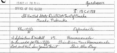 Cito, por apego ao debate, o caso da americana Sylvia Ann Driskell, que se alto-intitulou "Embaixadora de Deus e de Jesus Cristo" e entrou com um processo contra todos os homossexuais do mundo sob a acusação de quebra “das leis religiosas e morais”, Tribunal Distrital de Omaha, no Estado de Nebraska (EUA). Pode isso?