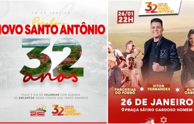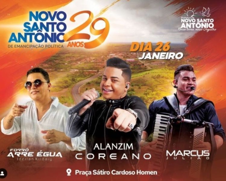 A Prefeitura de Novo Santo Antônio (PI) estará em festa no dia 26 de janeiro celebrando 29 anos de emancipação com os shows de Alanzinho Coreano, Marcus Julião e Forró Arre Égua, de Praça Sátiro Cardoso, além de uma vasta programação que será divulgada em breve.