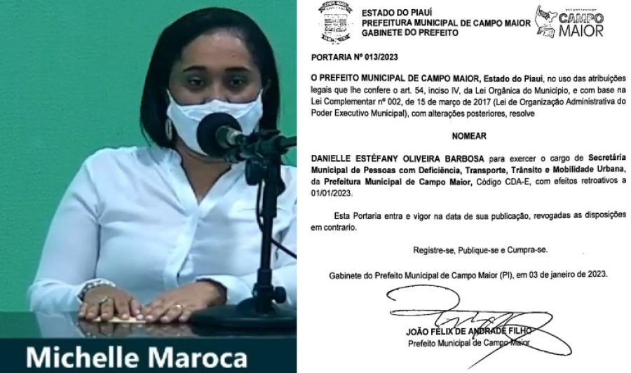 A vereadora Michele Maroca, líder da oposição na Câmara de Campo Maior, mudou pela terceira vez de posicionamento e deixou o bloco de vereadores contrários a João Félix para se unir ao prefeito. Logo após o alinhamento, o prefeito publicou a nomeação de Daniele Estéfany Oliveira Barbosa, irmã da parlamentar, que assume o cargo de Secretária Municipal de Pessoas com Deficiência, Transporte, Trânsito e Mobilidade Urbana.